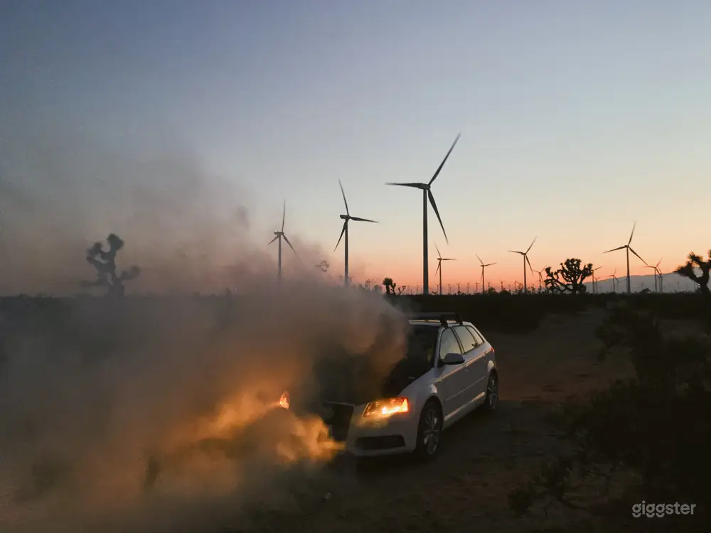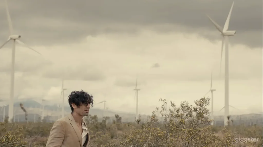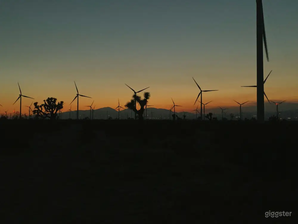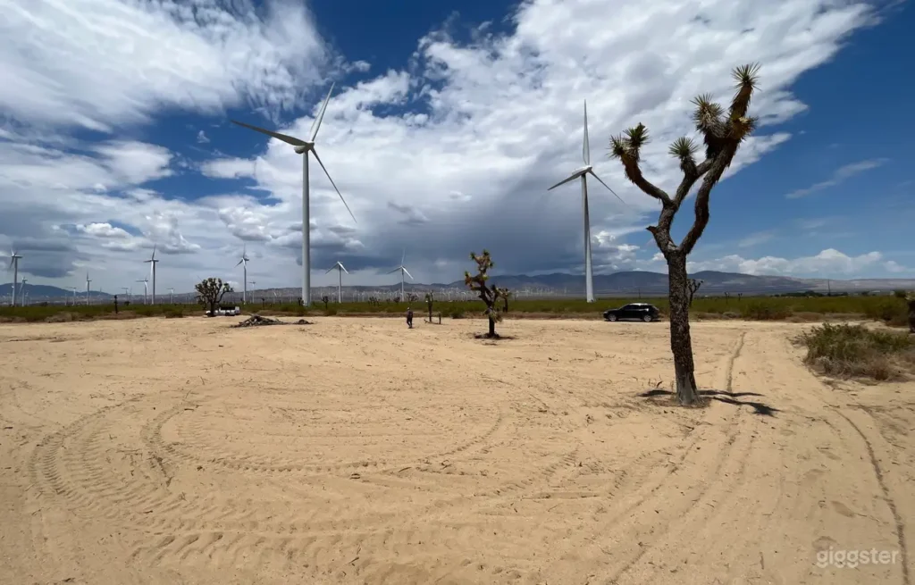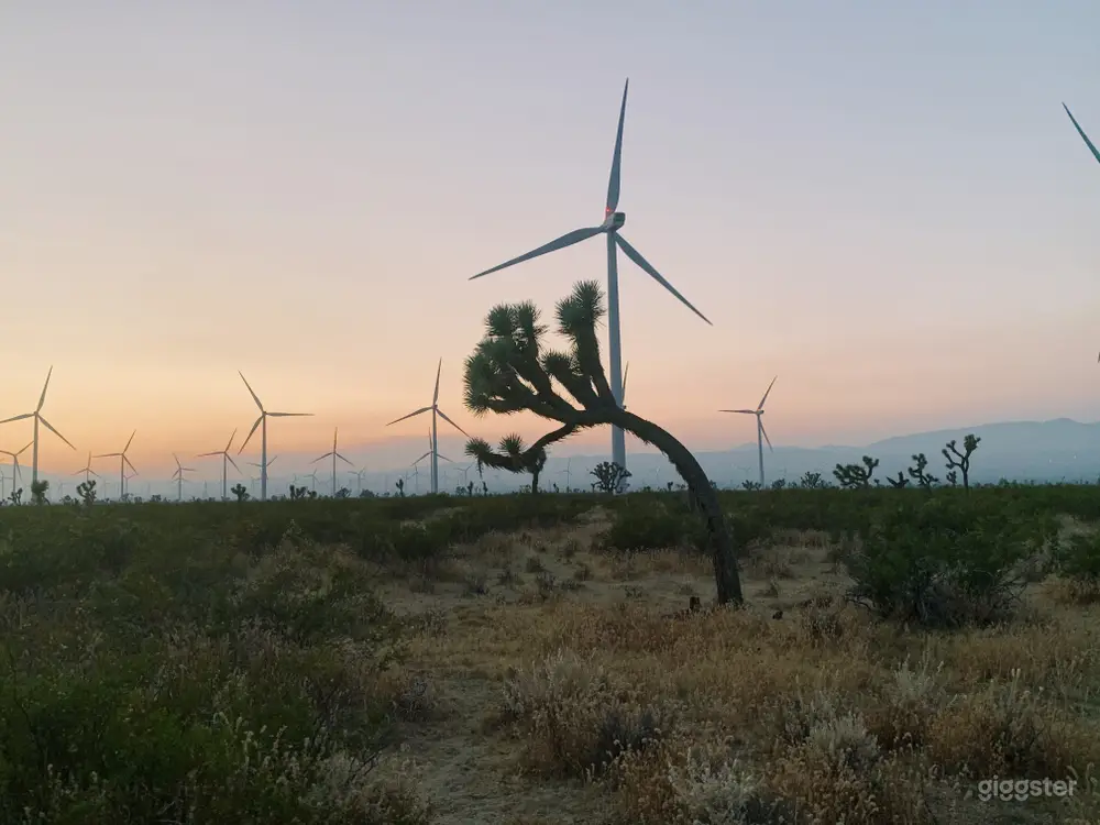 The Vibe: An epic, high-desert landscape featuring a 360-degree view of the remote Mojave Desert, with a massive wind turbine field serving as the dramatic, industrial backdrop.